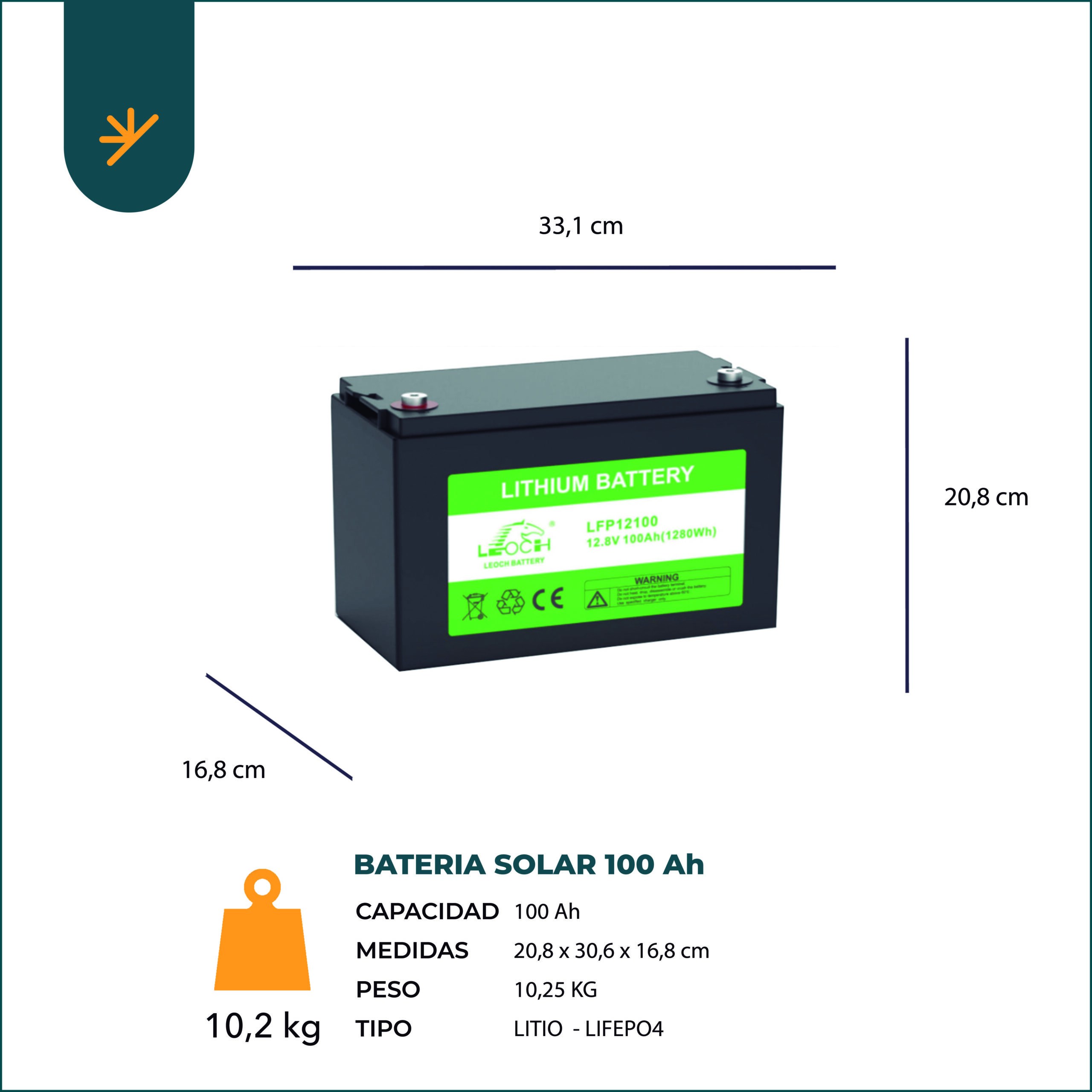 La batería de Litio 100Ah es una solución de almacenamiento de energía de alta eficiencia, ideal para sistemas solares. Utiliza tecnología de fosfato de hierro y litio (LiFePO4), reconocida por su seguridad, durabilidad y rendimiento sostenido.