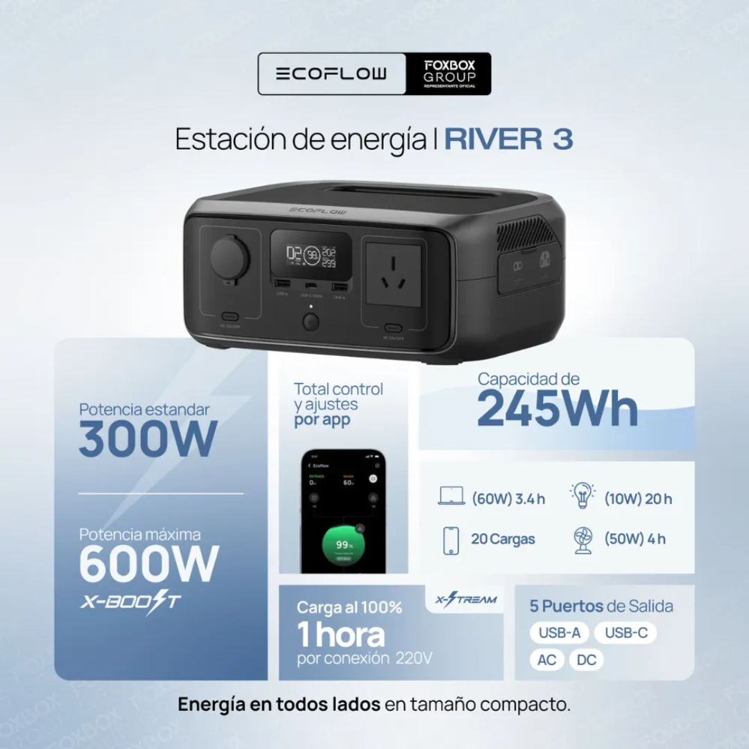 Estación de Energía EcoFlow River 3 UPS 245 Wh, es una estación de energía portátil con función UPS integrada, que permite alimentar y proteger tus equipos frente a cortes de luz con conmutación rápida y sin interrupciones. Su diseño compacto, batería de larga vida y múltiples puertos la hacen ideal para respaldo doméstico, camping o uso diario en exteriores.