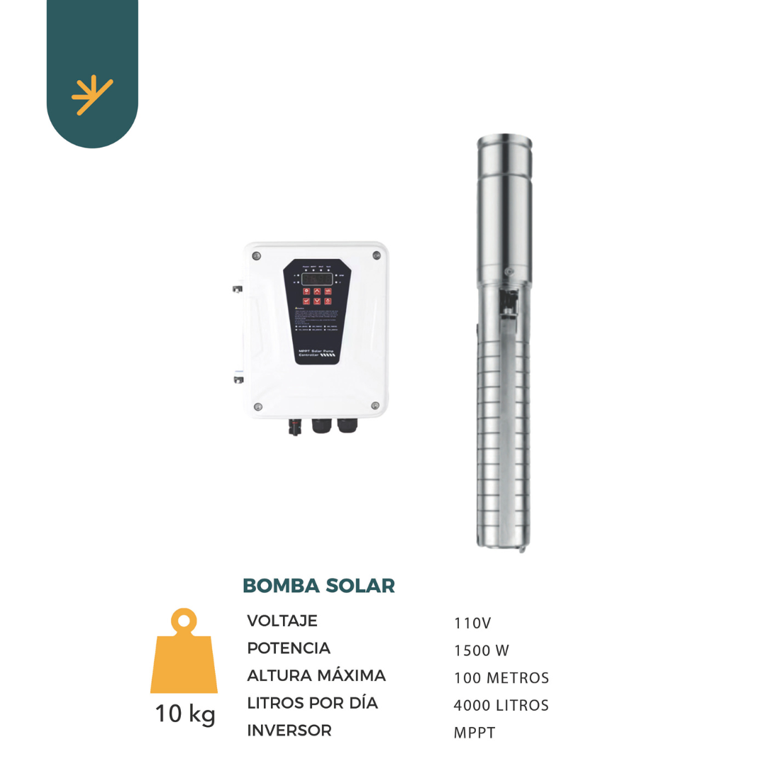 La bomba solar, a través de los paneles solares, utiliza energía solar para bombear agua desde un pozo a una altura máxima de 100 metros, con una capacidad de 4000 litros por día. El panel solar convierte la luz solar en electricidad, la cual es utilizada directamente por la bomba solar para mover el agua.