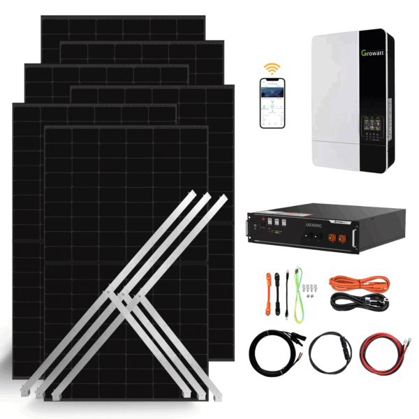 Kit Solar Off Grid 5000W, sistema completo y potente diseñado para hogares conectados a la red eléctrica o totalmente aislados, que combina respaldo automático, ahorro en la factura y energía confiable de alta duración. Este kit incluye paneles solares, baterías de litio Pylontech y el inversor Growatt de 5000W con regulador MPPT 100A, optimizando al máximo la energía generada por los paneles.