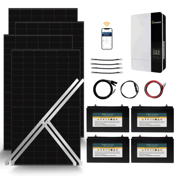 Kit Solar Off Grid 5000w, sistema completo diseñado para hogares conectados a la red eléctrica o totalmente aislados, que combina respaldo automático, ahorro en la factura y energía confiable. Este kit incluye paneles solares, baterías y el potente inversor Growatt de 5000W con regulador MPPT 100A, que maximiza la eficiencia de los paneles, aprovechando al máximo cada rayo de sol.