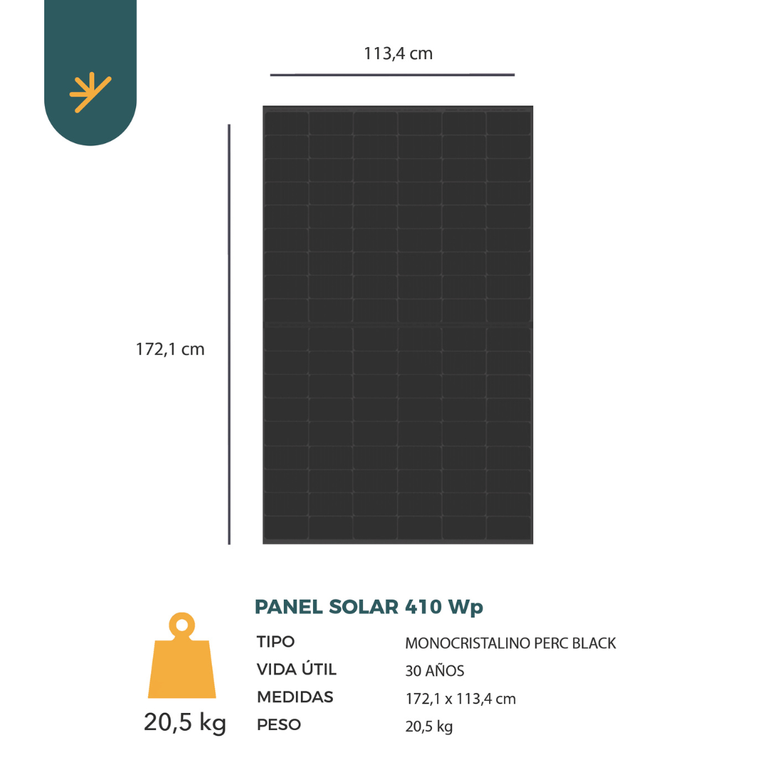 - 2 Paneles Solares de 410W monocristalinos PERC BLACK con vida útil de 30 años