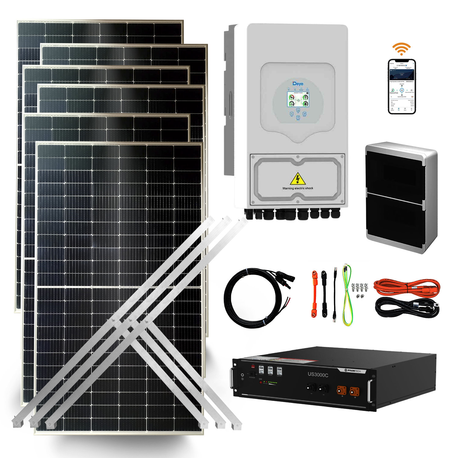 - Todos los cables y conectores: Cables solares certificados, conectores MC4 y cableado para baterías.