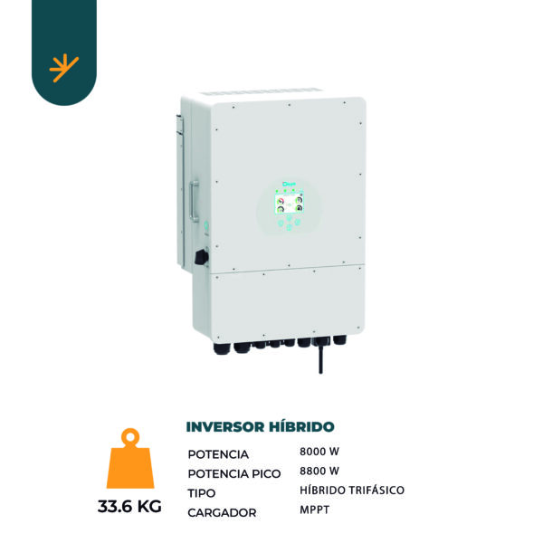 Kit Solar Híbrido de 8 kW, el sistema más completo y avanzado del mercado. Combina las ventajas de los kits on grid (que generan ahorro en la factura de luz) con los off grid (que almacenan energía en baterías para usar durante un corte eléctrico). Esto significa que durante el día aprovecha la energía del sol para alimentar tu casa y reducir el consumo de la red, y cuando no hay luz o se corta el suministro, las baterías de respaldo mantienen encendidos los equipos.