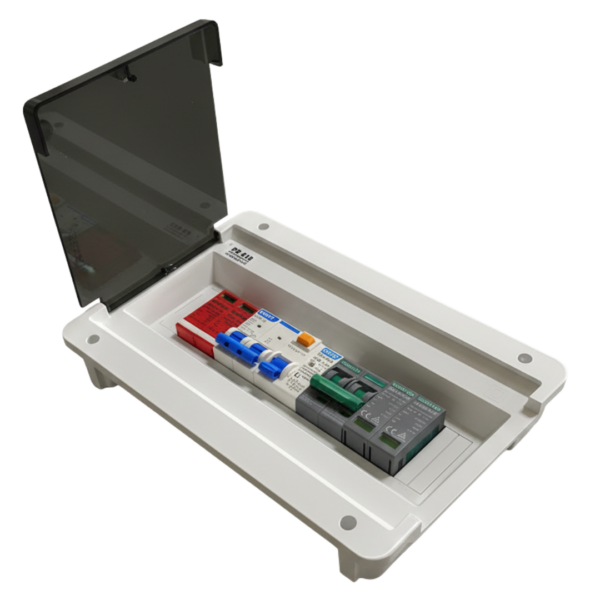 - Tablero exterior de PVC de 16 bocas: Alojamiento estanco y seguro para todos los dispositivos de protección.